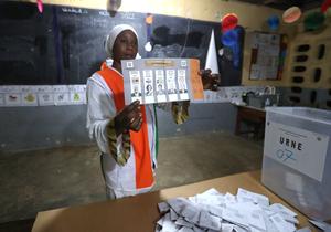 (251026) -- ABIYAN, 26 octubre, 2025 (Xinhua) -- Imagen del 25 de octubre de 2025 de una empleada mostrando una boleta en un colegio electoral, en Abiyán, Cote d'Ivoire. Los colegios electorales para las elecciones presidenciales de Cote d'Ivoire cerraron a las 18:00 hora local del sábado, marcando el comienzo del conteo de votos en Abiyán, reportaron los medios locales. (Xinhua/Yvan Sonh) (rtg) (da)