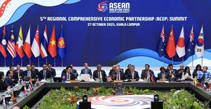 (251027) -- KUALA LUMPUR, 27 octubre, 2025 (Xinhua) -- La quinta Reunión de Líderes de la Asociación Económica Integral Regional (RCEP, por sus siglas en inglés) se celebra en Kuala Lumpur, Malasia, el 27 de octubre de 2025. (Xinhua/Xing Guangli) (rtg) (ah) (ce)