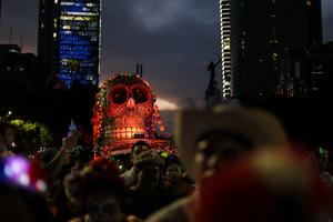 (251027) -- CIUDAD DE MEXICO, 27 octubre, 2025 (Xinhua) -- Imagen del 26 de octubre de 2025 de una escultura de un cráneo gigante vista en la Mega Procesión de las Catrinas 2025, en la Ciudad de México, capital de México. (Xinhua/Francisco Cañedo) (fc) (oa) (ah) (ce)