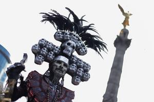(251027) -- CIUDAD DE MEXICO, 27 octubre, 2025 (Xinhua) -- Imagen del 26 de octubre de 2025 de un hombre caracterizado participando en la Mega Procesión de las Catrinas 2025, en la Ciudad de México, capital de México. (Xinhua/Francisco Cañedo) (fc) (oa) (ah) (ce)