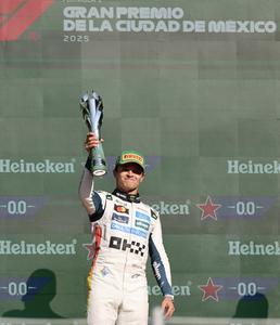 (251027) -- CIUDAD DE MEXICO, 27 octubre, 2025 (Xinhua) -- Imagen del 26 de octubre de 2025 del ganador del primer lugar, el piloto británico de la escudería McLaren, Lando Norris, participando en la ceremonia de premiación del Gran Premio de la Ciudad de México 2025 de Fórmula Uno, en el Autódromo Hermanos Rodríguez, en la Ciudad de México, capital de México. (Xinhua/Li Mengxin) (rtg) (ah) (ce)