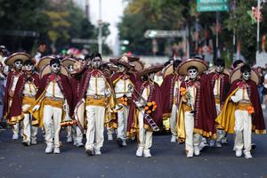 (251027) -- CIUDAD DE MEXICO, 27 octubre, 2025 (Xinhua) -- Imagen del 26 de octubre de 2025 de personas caracterizadas como catrines participando en la Mega Procesión de las Catrinas 2025, en la Ciudad de México, capital de México. La Procesión de las Catrinas se celebró el domingo previo al Día de Muertos. (Xinhua/Francisco Cañedo) (oa) (ah) (ce)