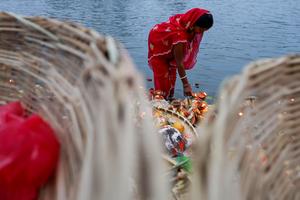 (251027) -- KATMANDU, 27 octubre, 2025 (Xinhua) -- Una devota hindú ofrece sus oraciones al sol poniente con motivo del festival de Chhath, en Katmandú, Nepal, el 27 de octubre de 2025. El festival Chhath está dedicado al sol, y los devotos hindúes hacen ofrendas al sol poniente y al sol naciente. (Xinhua/Sulav Shrestha) (oa) (ah) (ce)