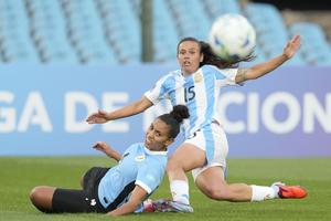 (251029) -- MONTEVIDEO, 29 octubre, 2025 (Xinhua) -- Imagen del 28 de octubre de 2025 de la jugadora Carina Felipe (i), de Uruguay, disputando el balón con Florencia Bonsegundo (d), de Argentina, durante el partido correspondiente a la jornada 2 de la Liga de Naciones Femenina de la Conmebol, celebrado en el Estadio Centenario, en Montevideo, capital de Uruguay. (Xinhua/Nicolás Celaya) (nc) (ah) (ra) (ce)
