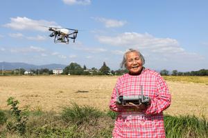 (251029) -- TONGCHENG, 29 octubre, 2025 (Xinhua) -- Imagen del 23 de octubre de 2025 de Dai Shuying posando para fotografías con un dron de protección de plantas, en la aldea de Laomei del poblado de Xindu, en la ciudad de Tongcheng, en la provincia de Anhui, en el este de China. Dai Shuying, de 82 años de edad, vive con su hijo mayor y su nieto. Aunque actualmente no realiza muchas labores agrícolas, ocasionalmente utiliza un dron para ayudar a los agricultores a fumigar con pesticidas y fertilizantes, bajo la supervisión de su nieto Wang Tiantian. Acompañada de Wang, también promociona y vende productos agrícolas como arroz y aceite a través de transmisiones en vivo, y disfruta grabando videos con él. (Xinhua/Du Xiaoyi) (ah) (ra) (ce)