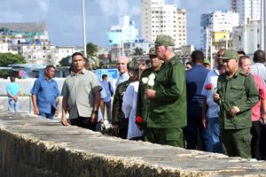 (251029) -- LA HABANA, 29 octubre, 2025 (Xinhua) -- Imagen del 28 de octubre de 2025 del presidente cubano, Miguel Díaz-Canel (frente), sosteniendo una flor antes de arrojarla al mar en un homenaje al comandante guerrillero, Camilo Cienfuegos, a 66 años de su desaparición física, en La Habana, capital de Cuba. Cuba rindió homenaje el martes a Cienfuegos en un acto político-cultural celebrado en la capital que contó con la presencia de Díaz-Canel y miembros del Buró Político del Partido Comunista de Cuba. (Xinhua/Joaquín Hernández) (jh) (jg) (da) (ce)                     (251029) -- LA HABANA, 29 octubre, 2025 (Xinhua) -- Imagen del 28 de octubre de 2025 del presidente cubano, Miguel Díaz-Canel (frente), sosteniendo una flor antes de arrojarla al mar en un homenaje al comandante guerrillero, Camilo Cienfuegos, a 66 años de su desaparición física, en La Habana, capital de Cuba. Cuba rindió homenaje el martes a Cienfuegos en un acto político-cultural celebrado en la capital que contó con la presencia de Díaz-Canel y miembros del Buró Político del Partido Comunista de Cuba. (Xinhua/Joaquín Hernández) (jh) (jg) (da) (ce)