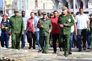 (251029) -- LA HABANA, 29 octubre, 2025 (Xinhua) -- Imagen del 28 de octubre de 2025 del presidente cubano, Miguel Díaz-Canel (d-frente), y el miembro del Buró Político y secretario de Organización del Partido Comunista de Cuba, Roberto Morales Ojeda (i-frente), participando en un homenaje al comandante guerrillero, Camilo Cienfuegos, a 66 años de su desaparición física, en La Habana, capital de Cuba. Cuba rindió homenaje el martes a Cienfuegos en un acto político-cultural celebrado en la capital que contó con la presencia de Díaz-Canel y miembros del Buró Político del Partido Comunista de Cuba. (Xinhua/Joaquín Hernández) (jh) (jg) (da) (ce)