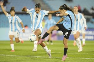 (251029) -- MONTEVIDEO, 29 octubre, 2025 (Xinhua) -- Imagen del 28 de octubre de 2025 de la jugadora Belén Aquino (d), de Uruguay, disputando el balón con Abril Reche (c), de Argentina, durante el partido correspondiente a la jornada 2 de la Liga de Naciones Femenina de la Conmebol, celebrado en el Estadio Centenario, en Montevideo, capital de Uruguay. (Xinhua/Nicolás Celaya) (nc) (ah) (ra) (ce)