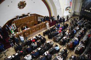 (251028) -- CARACAS, 28 octubre, 2025 (Xinhua) -- Diputados venezolanos participan en una sesión de la Asamblea Nacional, en el Palacio Federal Legislativo, en Caracas, Venezuela, el 28 de octubre de 2025. El Parlamento venezolano aprobó el martes por unanimidad el proyecto de acuerdo para declarar persona non grata a la primera ministra de Trinidad y Tobago, Kamla Persad-Bissessar, por sus actuaciones contra Venezuela. (Xinhua/Marcos Salgado) (ms) (oa) (ah) (ce)