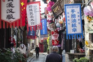 (251030) -- CHIBI, 30 octubre, 2025 (Xinhua) -- Imagen del 29 de octubre de 2025 de turistas visitando la antigua calle, en Yangloudong de la ciudad de Chibi, en la provincia de Hubei, en el centro de China. Yangloudong es conocida desde hace mucho tiempo como la cuna del té prensado y uno de los puntos de partida de una antigua ruta del té. (Xinhua/Wu Zhizun) (rtg) (ra) (ce)