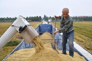 (251031) -- CHANGSHA, 31 octubre, 2025 (Xinhua) -- Imagen del 29 de octubre de 2025 de un agricultor cargando arroz cosechado a un camión en los campos, en la aldea de Wangjiahu, en el distrito de Datonghu de la ciudad de Yiyang, en la provincia de Hunan, en el centro de China. Más de 2.000 mu (cerca de 133,33 hectáreas) de arrozales tardíos operados por una cooperativa profesional en el distrito de Datonghu de la ciudad de Yiyang han entrado en la temporada de cosecha. (Xinhua/Chen Zhenhai) (rtg) (ra) (ce)