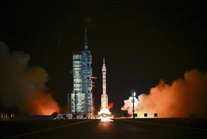 (251031) -- JIUQUAN, 31 octubre, 2025 (Xinhua) -- La nave espacial tripulada Shenzhou-21, colocada sobre el cohete portador Gran Marcha-2F, despega del Centro de Lanzamiento de Satélites de Jiuquan, en el noroeste de China, el 31 de octubre de 2025. China lanzó exitosamente la nave espacial tripulada Shenzhou-21 el viernes, para enviar a tres astronautas a su estación espacial orbital en una misión de seis meses. (Xinhua/Li Zhipeng) (rtg) (ra) (ce)