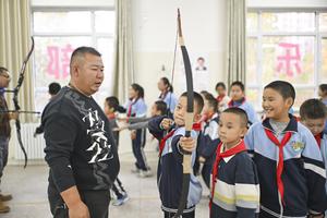 (251031) -- QAPQAL, 31 octubre, 2025 (Xinhua) -- Imagen del 23 de octubre de 2025 de Wu Junliang (i-frente) enseñando tiro con arco tradicional, en la Escuela Primaria No. 25 de Yining, en la ciudad de Yining, en la región autónoma uygur de Xinjiang, en el noroeste de China. Wu es un reconocido heredero del "Tiro con Arco Tradicional de Xibe", considerado patrimonio cultural inmaterial nacional, y se ha unido a la iniciativa "patrimonio en escuelas", ofreciendo entrenamiento de tiro con arco gratuito a estudiantes de escuela primaria. El es llamado el "entrenador campeón" por los estudiantes. (Xinhua/Hu Huhu) (rtg) (ra) (ce)