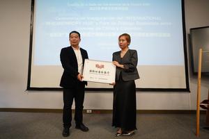 (251031) -- BOGOTA, 31 octubre, 2025 (Xinhua) -- Imagen del 30 de octubre de 2025 del director del Centro de Innovación y Desarrollo Social Songding de Shanghai, Guo Yangang (i), y la directora del Instituto Confucio de la Universidad Jorge Tadeo Lozano, Fang Han (d), sosteniendo una placa conmemorativa durante un foro en el marco del Día Mundial de las Ciudades, en la Universidad Jorge Tadeo Lozano, en Bogotá, capital de Colombia. Analistas y expertos en urbanización se dieron cita en la Universidad Jorge Tadeo Lozano de Bogotá en el marco del Día Mundial de las Ciudades, ocasión que sirvió para que especialistas chinos y colombianos intercambiaran opiniones sobre el urbanismo. (Xinhua/Andrés Moreno) (am) (rtg) (ra) (ce)