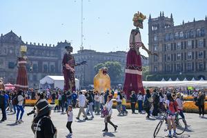 (251031) -- CIUDAD DE MEXICO, 31 octubre, 2025 (Xinhua) -- Personas visitan la Ofrenda Monumental del Día de Muertos con el tema de los 700 años de la fundación de México-Tenochtitlán, en el Zócalo de la Ciudad de México, capital de México, el 31 de octubre de 2025. (Xinhua/Li Muzi) (oa) (ra) (ce)