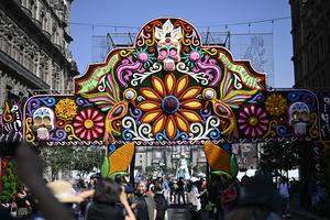 (251031) -- CIUDAD DE MEXICO, 31 octubre, 2025 (Xinhua) -- Imagen del 31 de octubre de 2025 de decoraciones del Día de Muertos, en el Zócalo de la Ciudad de México, capital de México. (Xinhua/Li Muzi) (oa) (ra) (ce)