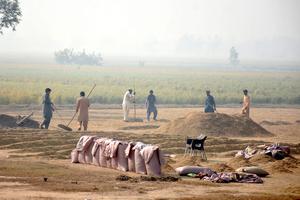 (251030) -- LAHORE, 30 octubre, 2025 (Xinhua) -- Agricultores trabajan en un campo envuelto por esmog, en Lahore, Pakistán, el 30 de octubre de 2025. (Xinhua/Sajjad) (rtg) (ra) (ce)