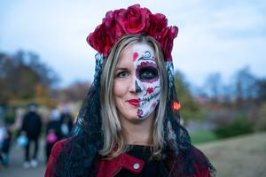 (251031) -- PRAGA, 31 octubre, 2025 (Xinhua) -- Una mujer con el rostro pintado posa para una fotografía en un jardín botánico, en Praga, República Checa, el 31 de octubre de 2025. Personas disfrutaron de diversión y juegos en el jardín botánico durante las celebraciones del Festival de Halloween. (Xinhua/Dana Kesnerova) (oa) (ra) (ce)