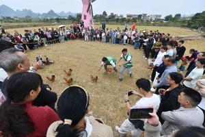 (251101) -- GUANGXI, 1 noviembre, 2025 (Xinhua) -- Personas participan en un concurso de captura de pollos y patos durante una celebración de la cosecha, en la aldea de Silang de Liuzhou, en la región autónoma zhuang de Guangxi, en el sur de China, el 1 de noviembre de 2025. (Xinhua/Zheng Changhao) (oa) (da)