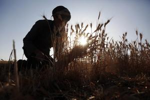 (251101) -- SANA, 1 noviembre, 2025 (Xinhua) -- Imagen del 31 de octubre de 2025 de un agricultor cosechando trigo de su granja, en las afueras de Saná, Yemen. (Xinhua/Mohammad Mohammad) (jg) (rda)