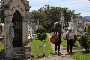 (251102) -- SAN SALVADOR, 2 noviembre, 2025 (Xinhua) -- Músicos cargan instrumentos mientras caminan entre las tumbas durante la conmemoración del Día de los Difuntos en el Cementerio de Los Ilustres, en el departamento de San Salvador, capital de El Salvador, el 2 de noviembre de 2025. (Xinhua/Alexander Peña) (ap) (rtg) (ah)