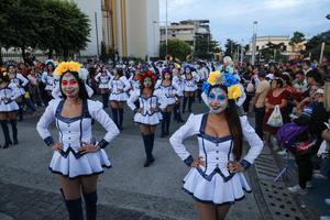 (251103) -- SAN SALVADOR, 3 noviembre, 2025 (Xinhua) -- Imagen del 2 de noviembre de 2025 de jóvenes porristas portando maquillaje facial de catrinas mientras bailan durante el desfile de Catrinas y Catrines organizado en el marco del Día de los Difuntos, en el Centro Histórico, en el departamento de San Salvador, capital de El Salvador. (Xinhua/Alexander Peña) (ap) (rtg) (ah) (ce)