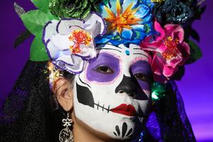(251103) -- SAN SALVADOR, 3 noviembre, 2025 (Xinhua) -- Imagen del 2 de noviembre de 2025 de una mujer portando un atuendo y maquillaje facial de catrina mientras participa en el desfile de Catrinas y Catrines organizado en el marco del Día de los Difuntos, en el Centro Histórico, en el departamento de San Salvador, capital de El Salvador. (Xinhua/Alexander Peña) (ap) (rtg) (ah) (ce)