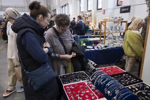 (251102) -- HELSINKI, 2 noviembre, 2025 (Xinhua) -- Imagen del 1 de noviembre de 2025 de visitantes seleccionando artículos en una vitrina de joyas antiguas en la Feria de Antigüedades de Helsinki 2025, en Helsinki, capital de Finlandia. La feria, de dos días de duración, se inauguró aquí el sábado. Como una de las mayores exposiciones y eventos comerciales de antigüedades de Finlandia, la feria de este año reunió a casi 40 expositores de todo el país y atrajo a una gran multitud de coleccionistas y visitantes. (Xinhua/Matti Matikainen) (oa) (da)