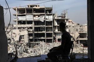(251103) -- GAZA, 3 noviembre, 2025 (Xinhua) -- Imagen del 2 de noviembre de 2025 de un palestino sentado en un edificio destruido, en el campamento de refugiados de Jabalia, en el norte de Gaza. (Xinhua/Rizek Abdeljawad) (oa) (ah) (ce)