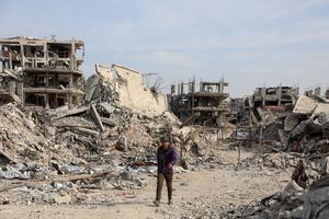 (251103) -- GAZA, 3 noviembre, 2025 (Xinhua) -- Imagen del 2 de noviembre de 2025 de un palestino caminando por un sendero flanqueado por edificios destruidos, en el campamento de refugiados de Jabalia, en el norte de Gaza. (Xinhua/Rizek Abdeljawad) (oa) (ah) (ce)