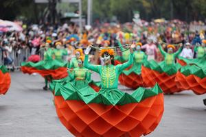 (251102) -- CIUDAD DE MEXICO, 2 noviembre, 2025 (Xinhua) -- Imagen del 1 de noviembre de 2025 de personas portando disfraces y maquillaje facial mientras participan en el Desfile del Día de Muertos, en el centro de la Ciudad de México, capital de México. (Xinhua/Li Mengxin) (rtg) (da)