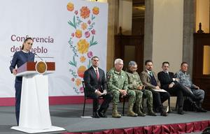 (251103) -- CIUDAD DE MEXICO, 3 noviembre, 2025 (Xinhua) -- La presidenta mexicana, Claudia Sheinbaum (i), habla durante su conferencia de prensa matutina, en Palacio Nacional, en la Ciudad de México, capital de México, el 3 de noviembre de 2025. Sheinbaum afirmó el lunes que su Gobierno usará "toda la fuerza del Estado" para enfrentar al crimen organizado, aunque descartó que ello implique una nueva guerra contra el narcotráfico. (Xinhua/Francisco Cañedo) (fc) (oa) (ah) (ce)