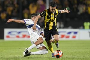 (251103) -- MONTEVIDEO, 3 noviembre, 2025 (Xinhua) -- Imagen del 2 de noviembre de 2025 del jugador Leonardo Fernández (d), de Peñarol, disputando el balón con Nicolás Wunsch (i), de Defensor Sporting durante el partido correspondiente al Torneo Clausura del Campeonato Uruguayo de Fútbol, celebrado en el estadio Campeón del Siglo, en Montevideo, capital de Uruguay. (Xinhua/Nicolás Celaya) (nc) (rtg) (ah) (ce)