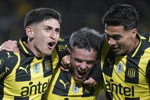 (251103) -- MONTEVIDEO, 3 noviembre, 2025 (Xinhua) -- Imagen del 2 de noviembre de 2025 del jugador Lucas Hernández (c), de Peñarol, festejando su anotación junto a sus compañeros durante el partido correspondiente al Torneo Clausura del Campeonato Uruguayo de Fútbol ante Defensor Sporting, celebrado en el Estadio Campeón del Siglo, en Montevideo, capital de Uruguay. (Xinhua/Nicolás Celaya) (nc) (rtg) (ah) (ce)