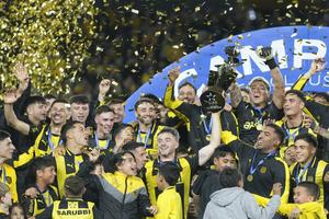 (251103) -- MONTEVIDEO, 3 noviembre, 2025 (Xinhua) -- Imagen del 2 de noviembre de 2025 de jugadores de Peñarol festejando con la copa después de ganar el partido correspondiente al Torneo Clausura del Campeonato Uruguayo de Fútbol ante Defensor Sporting, celebrado en el Estadio Campeón del Siglo, en Montevideo, capital de Uruguay. (Xinhua/Nicolás Celaya) (nc) (rtg) (ah) (ce)