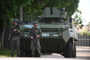 (251104) -- BELEM, 4 noviembre, 2025 (Xinhua) -- Soldados patrullan en las inmediaciones del parque municipal, sede de la 30ª Conferencia de las Partes (COP30) de la Convención Marco de las Naciones Unidas sobre Cambio Climático, en Belém, estado de Pará, Brasil, el 4 de noviembre de 2025. El presidente de Brasil, Luiz Inácio Lula da Silva, sancionó el martes el proyecto de ley que autoriza la transferencia temporal de la capital federal de Brasilia a la ciudad de Belém. La medida estará vigente del 11 al 21 de noviembre de 2025, periodo en el que Belém será sede de la COP30. (Xinhua/Lucio Tavora) (lt) (oa) (ah) (ce)