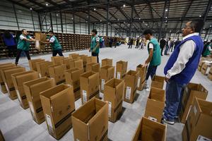 (251103) -- QUITO, 3 noviembre, 2025 (Xinhua) -- Empleados preparan cajas para el empaquetado del material electoral durante la presentación de los avances logísticos para el próximo proceso electoral, en las instalaciones de la empresa integradora Montgar, en la localidad de Pifo, en el extremo nororiental de Quito, Ecuador, el 3 de noviembre de 2025. El Consejo Nacional Electoral de Ecuador avanza en el proceso de armado y distribución de los paquetes electorales que se utilizarán en la consulta popular y el referendo constitucional convocados por el Gobierno para el próximo 16 de noviembre, informó el lunes la presidenta del organismo, Diana Atamaint. (Xinhua/Ricardo Landeta) (rl) (rtg) (ah) (ce)