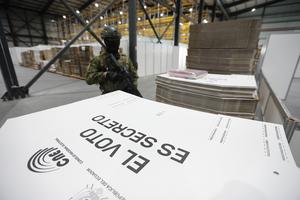 (251103) -- QUITO, 3 noviembre, 2025 (Xinhua) -- Un militar custodia urnas y mamparas electorales durante la presentación de los avances logísticos para el próximo proceso electoral, en las instalaciones de la empresa integradora Montgar, en la localidad de Pifo, en el extremo nororiental de Quito, Ecuador, el 3 de noviembre de 2025. El Consejo Nacional Electoral de Ecuador avanza en el proceso de armado y distribución de los paquetes electorales que se utilizarán en la consulta popular y el referendo constitucional convocados por el Gobierno para el próximo 16 de noviembre, informó el lunes la presidenta del organismo, Diana Atamaint. (Xinhua/Ricardo Landeta) (rl) (rtg) (ah) (ce)