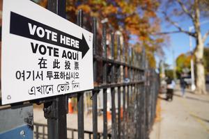 (251104) -- NUEVA YORK, 4 noviembre, 2025 (Xinhua) -- Un letrero apuntando hacia un colegio electoral es visto en Queens, Nueva York, Estados Unidos, el 4 de noviembre de 2025. La elección a la alcaldía de la Ciudad de Nueva York tuvo lugar el martes. (Xinhua/Zhang Fengguo) (jg) (ra) (ce)