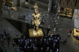(251104) -- EL CAIRO, 4 noviembre, 2025 (Xinhua) -- Turistas se reúnen alrededor del coloso del antiguo faraón egipcio Ramsés II, en el Gran Museo Egipcio (GEM, por sus siglas en inglés), en Giza, Egipto, el 4 de noviembre de 2025. El GEM, el museo más grande del mundo dedicado a una sola civilización, abrió sus puertas al público el martes. (Xinhua/Ahmed Gomaa) (jg) (ra) (ce)