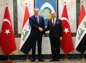 (251103) -- BAGDAD, 3 noviembre, 2025 (Xinhua) -- Imagen del 2 de noviembre de 2025 del ministro de Relaciones Exteriores iraquí, Fuad Hussein (d), reuniéndose con el ministro de Relaciones Exteriores turco, Hakan Fidan, en Bagdad, Irak. Irak y Turquía firmaron el domingo un mecanismo ejecutivo para la implementación de un acuerdo de cooperación en materia de agua, una medida que el primer ministro iraquí, Mohammed Shia' al-Sudani, calificó como "una de las soluciones sostenibles a la crisis del agua en Irak". (Xinhua/Khalil Dawood) (rtg) (ah) (ce)