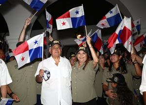 (251104) -- CIUDAD DE PANAMA, 4 noviembre, 2025 (Xinhua) -- Imagen del 3 de noviembre de 2025 del presidente panameño, José Raúl Mulino (i-frente), junto a la primera dama, Maricel Cohen de Mulino (d-frente), encabezando el inicio de la celebración por los 122 años de la Separación de Panamá de Colombia, en el Palacio de Las Garzas, en la Ciudad de Panamá, capital de Panamá. (Xinhua/Daniel González) (dg) (jg) (ra) (ce)