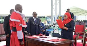 (251104) -- DODOMA, 4 noviembre, 2025 (Xinhua) -- Imagen del 3 de noviembre de 2025 de la presidenta tanzana, Samia Suluhu Hassan, prestando juramento durante la ceremonia de juramentación llevada a cabo en Dodoma, Tanzania. Hassan prestó juramento el lunes para otro mandato de cinco años, luego de recibir el 97,66 por ciento de los votos en las elecciones generales recientes. (Xinhua/Casa del Estado de Tanzania) (jg) (ra) (ce)