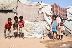 (251103) -- ADEN, 3 noviembre, 2025 (Xinhua) -- Niños desplazados se ponen de pie cerca de sus tiendas de campaña en un campamento, en las afueras de Adén, Yemen, el 3 de noviembre de 2025. La mayoría de los desplazados de Yemen viven en refugios en ruinas que no los protegen de las temperaturas gélidas. (Xinhua/Murad) (oa) (ah) (ce)