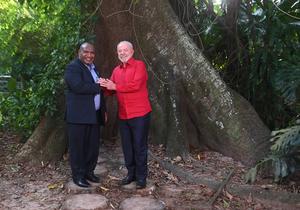 (251105) -- BELEM, 5 noviembre, 2025 (Xinhua) -- El presidente brasileño, Luiz Inácio Lula da Silva (d), estrecha la mano del primer ministro de Papúa Nueva Guinea, James Marape (i), durante una reunión previa a la Cumbre de Líderes de la 30ª Conferencia de las Partes (COP30) de la Convención Marco de las Naciones Unidas sobre el Cambio Climático, en el Museo Paraense Emilio Goeldi, en Belém, estado de Pará, Brasil, el 5 de noviembre de 2025. (Xinhua/Lucio Tavora) (lt) (ah) (ra) (ce)