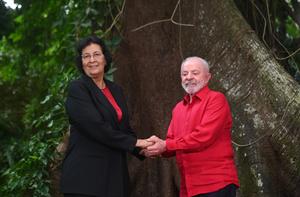 (251105) -- BELEM, 5 noviembre, 2025 (Xinhua) -- El presidente brasileño, Luiz Inácio Lula da Silva (d), estrecha la mano de la presidenta de Surinam, Jennifer Geerlings-Simons (i), durante una reunión previa a la Cumbre de Líderes de la 30ª Conferencia de las Partes (COP30) de la Convención Marco de las Naciones Unidas sobre el Cambio Climático, en el Museo Paraense Emilio Goeldi, en Belém, estado de Pará, Brasil, el 5 de noviembre de 2025. (Xinhua/Lucio Tavora) (lt) (ah) (ra) (ce)
