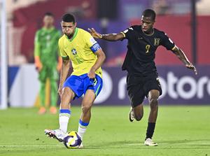 (251105) -- DOHA, 5 noviembre, 2025 (Xinhua) -- Imagen del 4 de noviembre de 2025 de Luis Eduardo (i), de Brasil, disputando el balón con David Flores, de Honduras, durante el partido del Grupo H entre Brasil y Honduras de la Copa Mundial Sub-17 de la FIFA Qatar 2025, en Doha, Qatar. (Xinhua/Nikku) (ah) (ra) (ce)