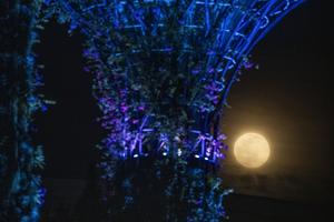 (251105) -- SINGAPUR, 5 noviembre, 2025 (Xinhua) -- La luna llena es vista sobre los Jardines de la Bahía, en Singapur, el 5 de noviembre de 2025. (Xinhua/Then Chih Wey) (ah) (ra) (ce)