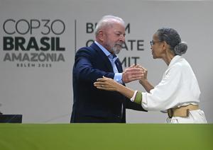 (251106) -- BELEM, 6 noviembre, 2025 (Xinhua) -- El presidente brasileño, Luiz Inácio Lula da Silva (i), saluda a la ministra de Medio Ambiente y Cambio Climático brasileña, Marina Silva (d), en la inauguración de la Cumbre de Líderes que antecede a la 30ª Conferencia de las Partes (COP30) de las Naciones Unidas sobre el Cambio Climático, en Belém, estado de Pará, Brasil, el 6 de noviembre de 2025. El presidente de Brasil, Luiz Inácio Lula da Silva, convocó el jueves a acelerar la transición energética hacia fuentes renovables y a proteger la naturaleza para contener el calentamiento global, al inaugurar la Cumbre de Líderes que antecede a la COP30 de las Naciones Unidas sobre el Cambio Climático, que se realizará del 10 al 21 de noviembre en la ciudad de Belém del estado amazónico de Pará (norte). (Xinhua/Lucio Tavora) (lt) (jg) (ah) (da)