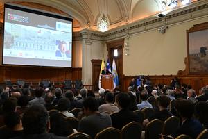 (251106) -- SANTIAGO, 6 noviembre, 2025 (Xinhua) -- Imagen del 5 de noviembre de 2025 del candidato a la Presidencia chilena, el diputado libertario, Johannes Kaiser (atrás), hablando durante el evento Seminarios Presidenciales 2025: Propuestas para Chile 2026-2030, Conversando con Johannes Kaiser, organizado por el Centro Latinoamericano de Políticas Económicas y Sociales en el Salón de Honor de la Casa Central de la Universidad Católica de Chile, en Santiago, capital de Chile. (Xinhua/Jorge Villegas) (jv) (jg) (ah) (da)